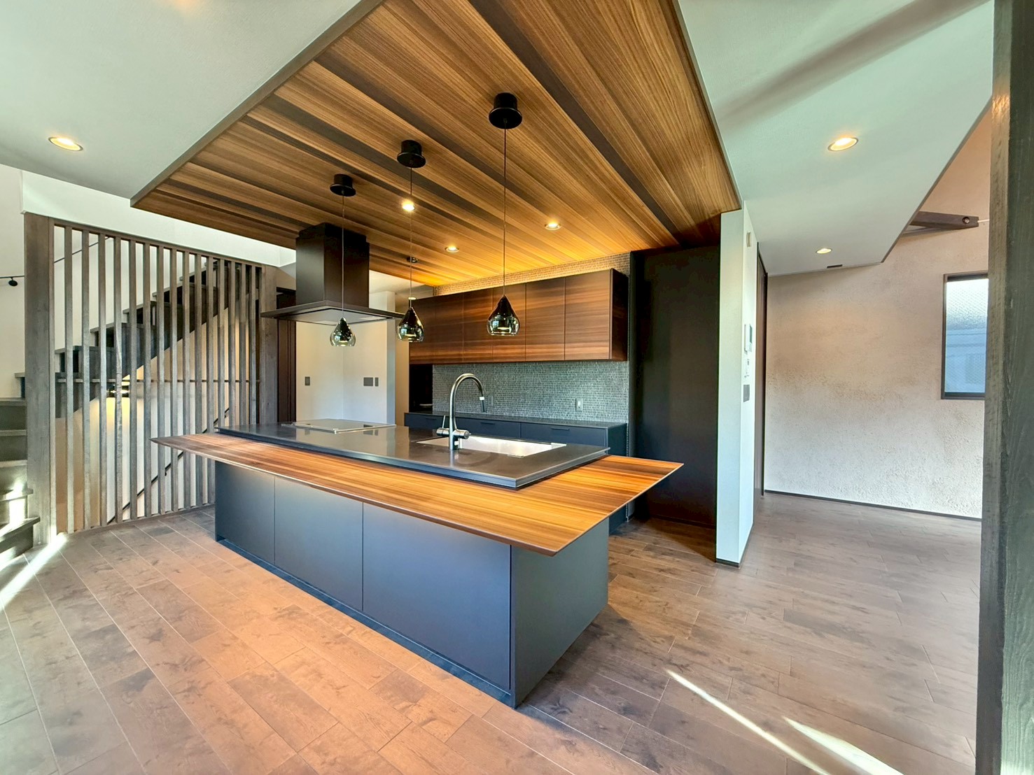 デザイン性の高い照明・天井材を採用し、落ち着きと温かみのある雰囲気を演出しています。