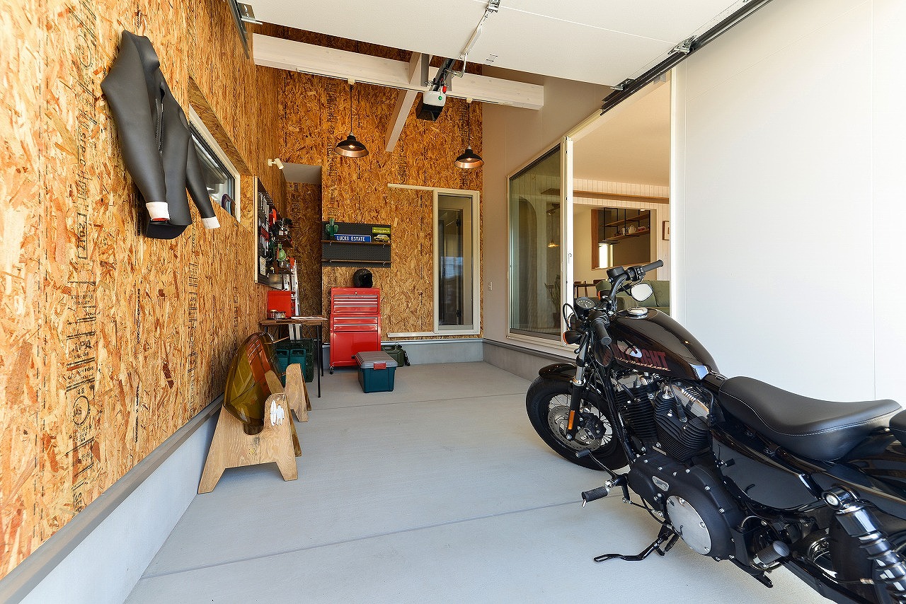 ガレージは、大切な車を保管するのはもちろん、雨の日でも気にせずお子様の遊び場として活躍したり、お気に入りのバイクのお手入れをしたり、本格的なフィットネスルームとして利用したり、DIYウォールにラックを作ってサーフボートを飾ったり、中でも外でもない使い方ができ、ライフスタイルに幅を持たせてくれます。