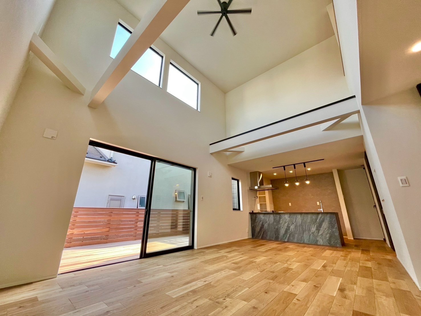 - LDK(約21.5帖)は上部吹抜けの為、明るく開放感がございます。またウッドデッキが繋がっております。