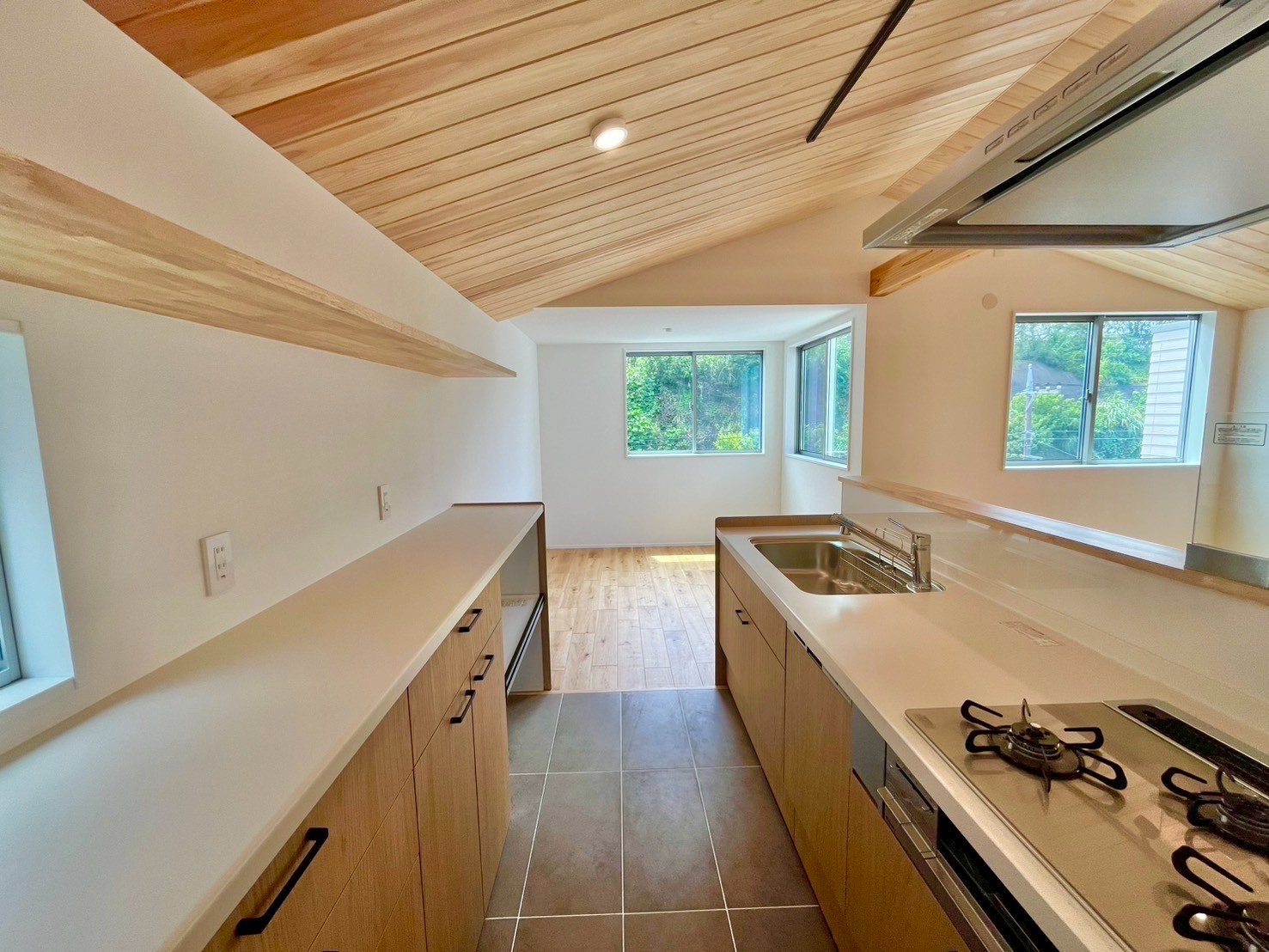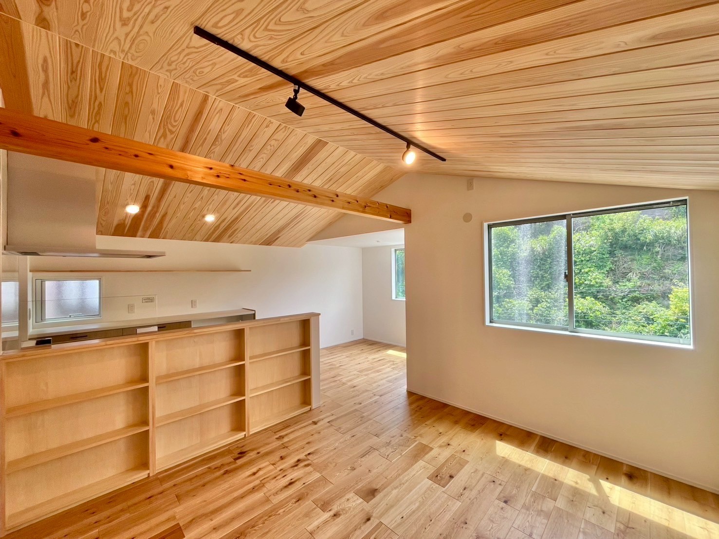 - リビング部分は無垢杉板張りの勾配天井となってり、開放感がございます ※A号棟