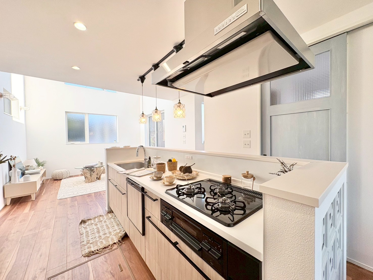 リビングやダイニングを見渡せる開放的なアイランドキッチン。