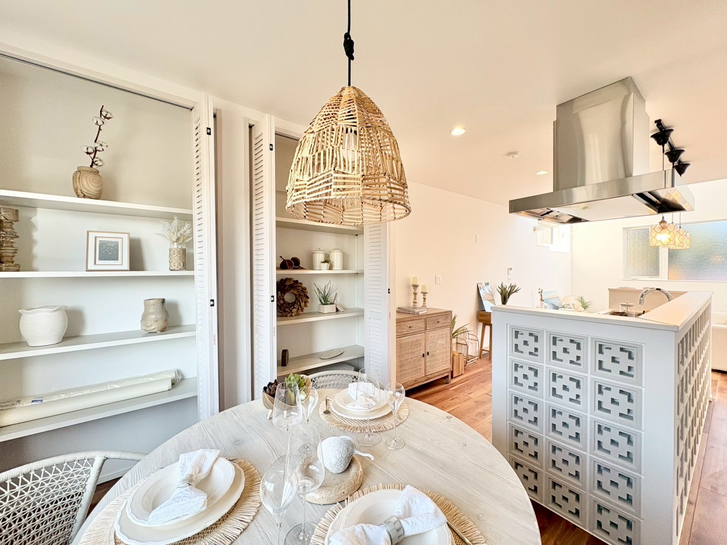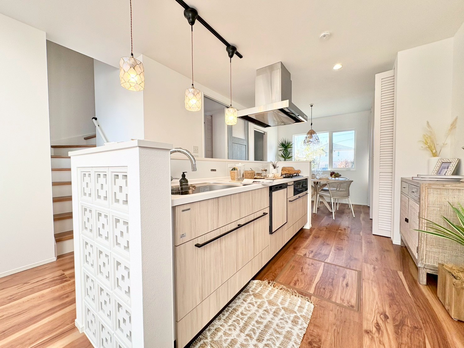 花ブロックやルーバー建具、シーリングファンにマリンライトなどなど、まさにリゾートスタイルです!