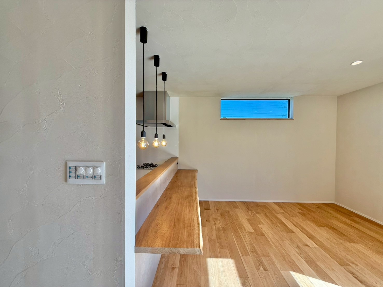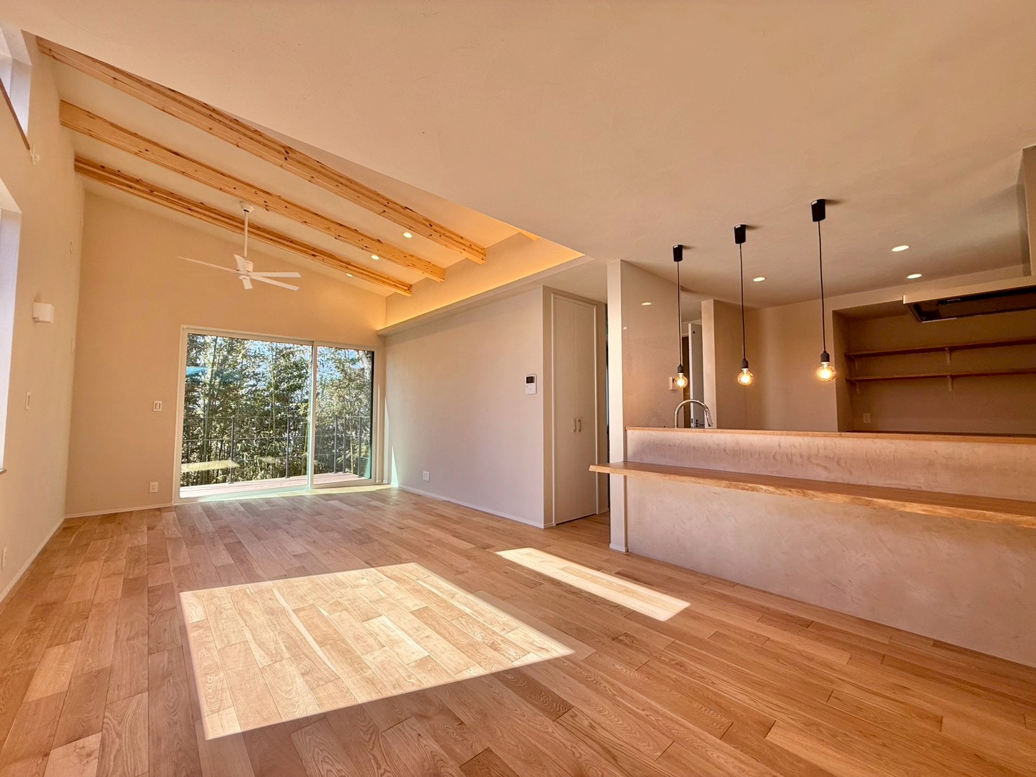 室内にはたっぷりと光が差し込み、開放的なリビング空間が家族の時間をやさしく包み込みます。