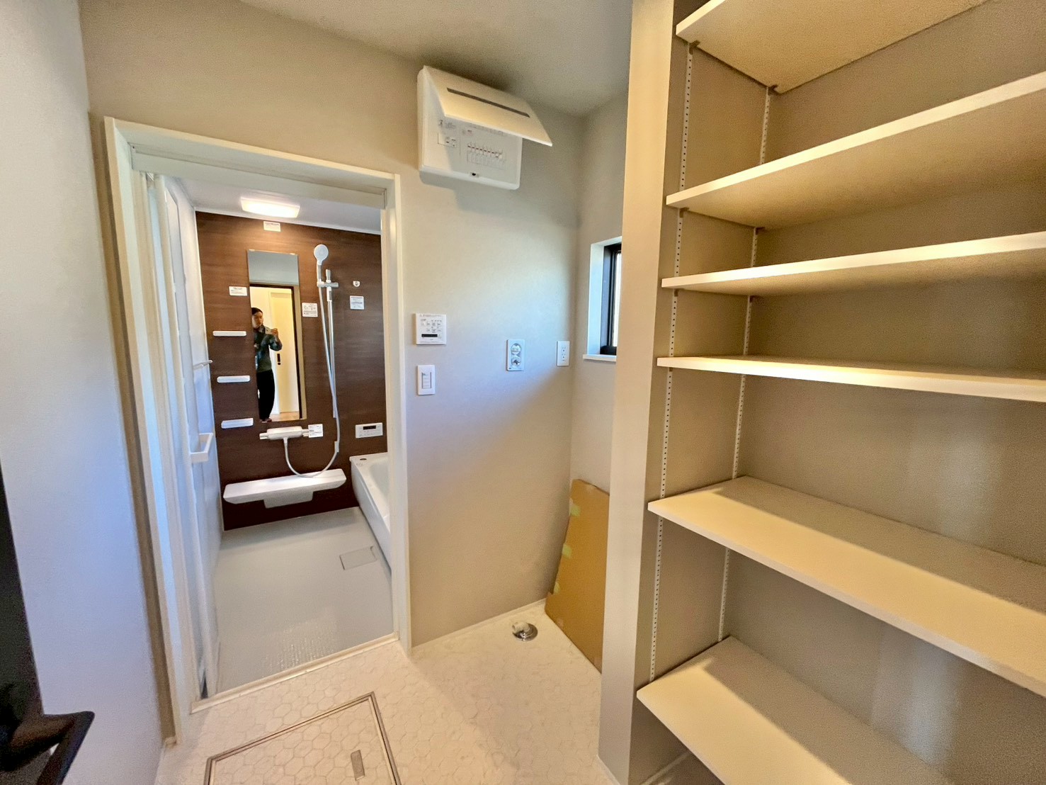 - 洗面室~浴室 洗面室には可動棚がございます