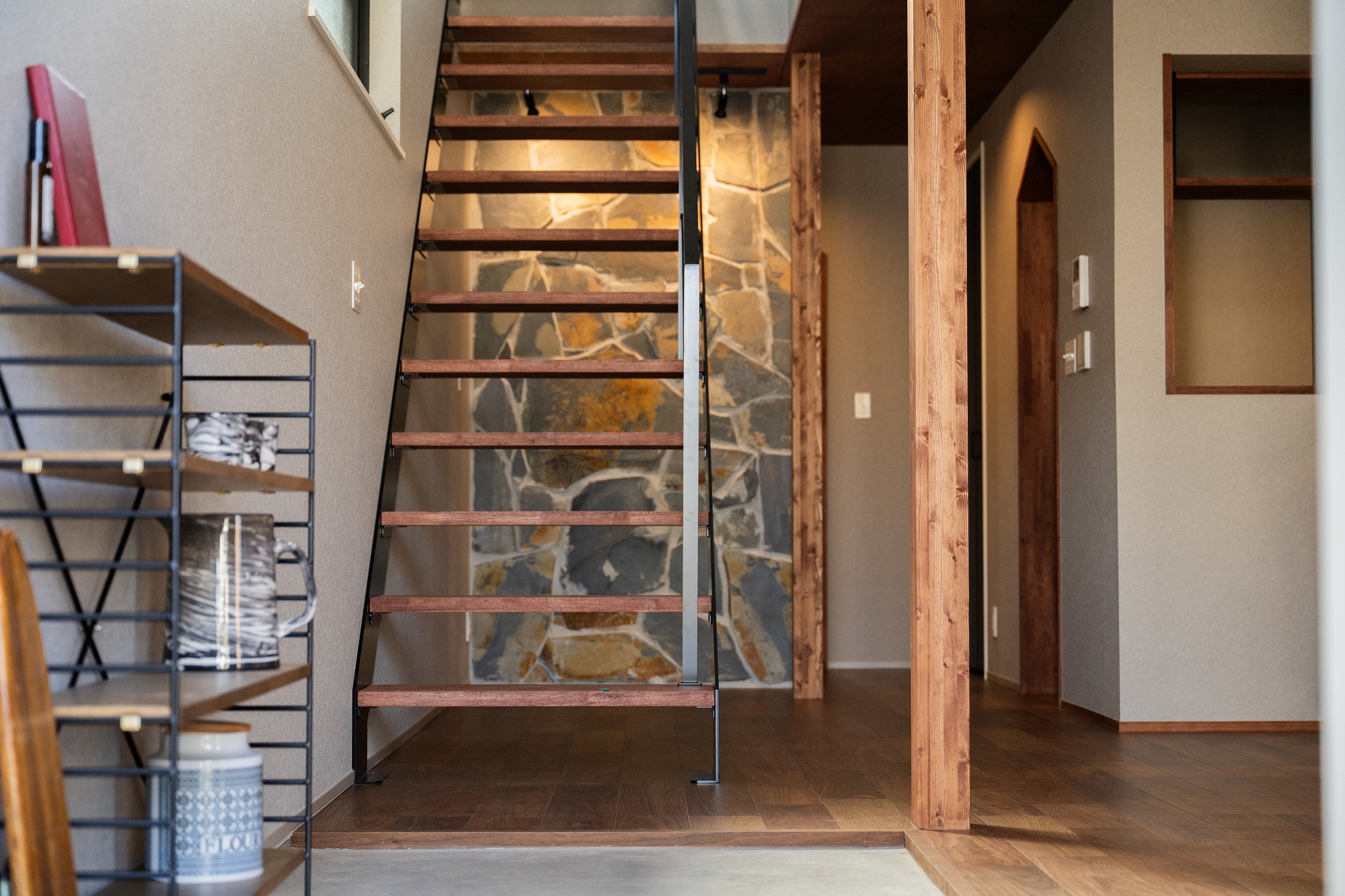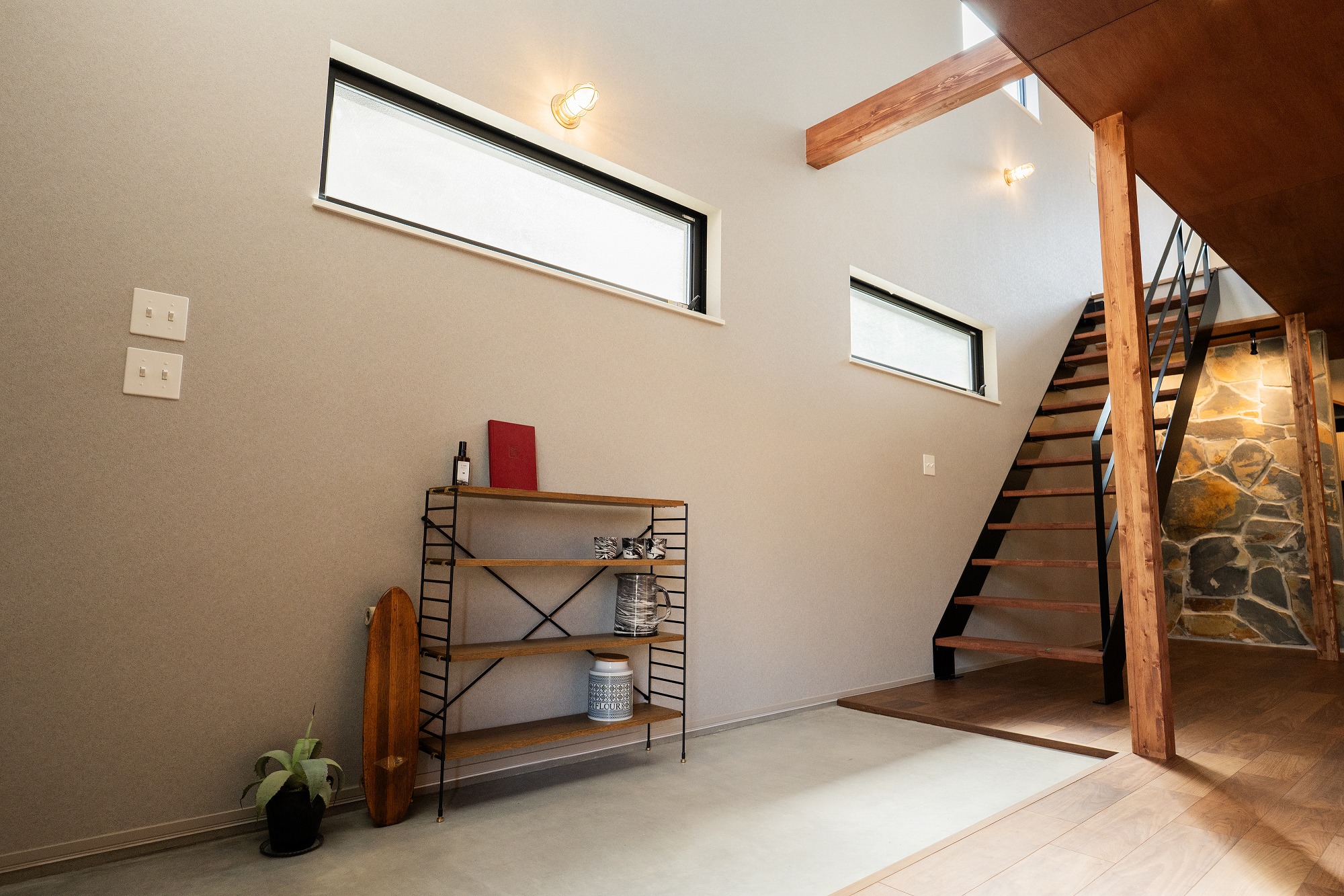 真っ直ぐ伸びる鉄骨階段と石張りの壁。