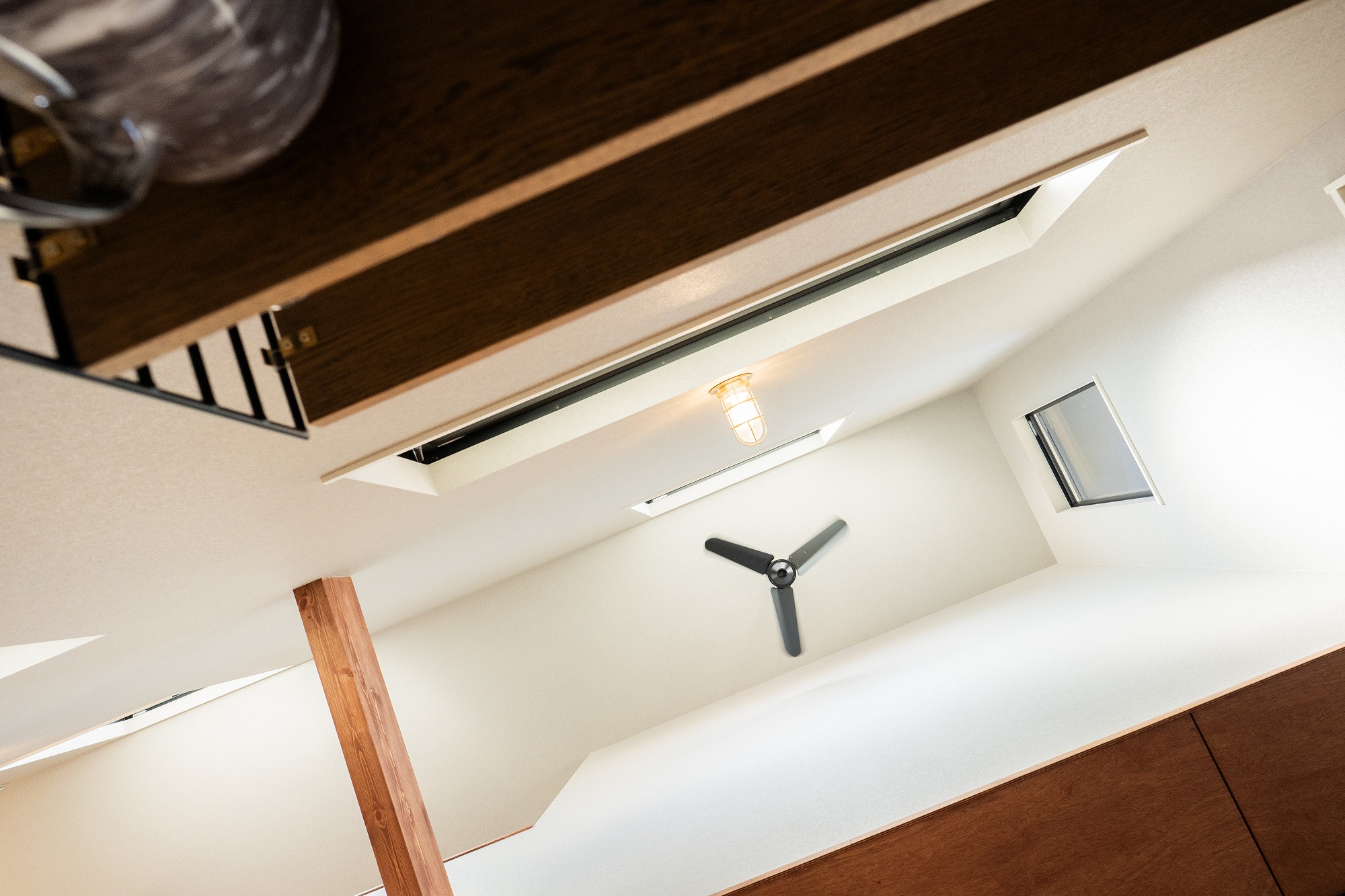 見上げると開放感のある吹抜けの上で回るシーリングファン。